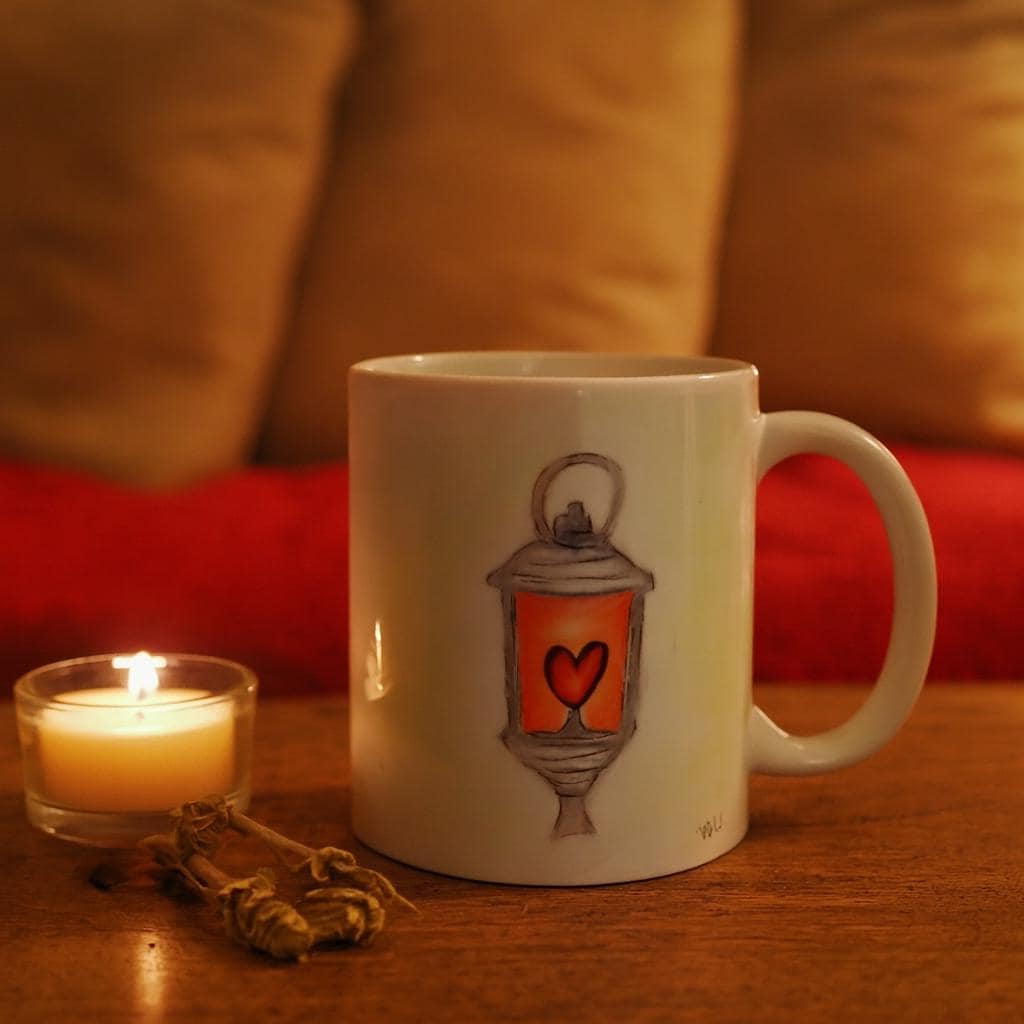 Χειροποίητη κεραμική κούπα με ζωγραφισμένο φανάρι σε στυλ watercolor και μια καρδιά που λάμπει στο κέντρο – σύμβολο αγάπης και φωτός. Στην άλλη πλευρά μπορείτε να προσθέσετε τη δική σας αφιέρωση, όνομα, ημερομηνία ή μια αγαπημένη φράση, δημιουργώντας ένα μοναδικό, προσωπικό δώρο. Ιδανικό για επέτειο, γάμο, του Αγίου Βαλεντίνου ή για μια τρυφερή καθημερινή στιγμή.
